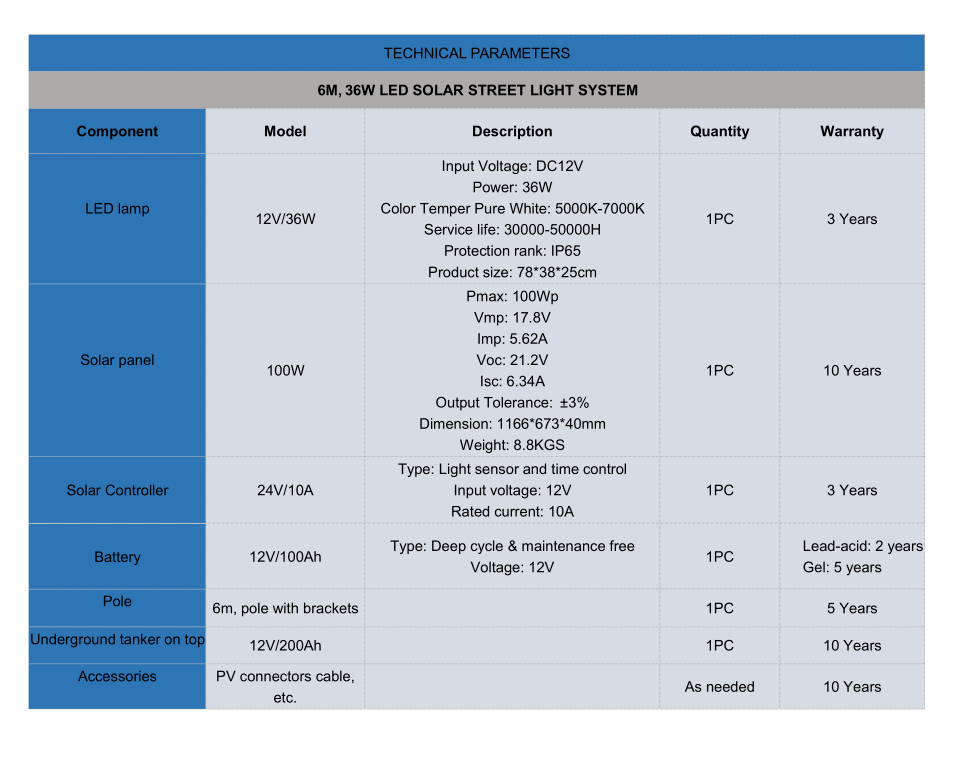6m, 36W Sistema de luz solar de rúa solar